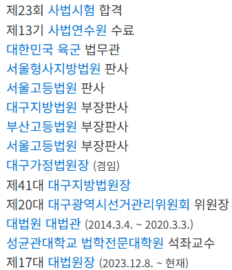 - 법관으로 재직하면서 대법원 재판연구관과 사법연수원 교수를 거쳤고, 서울중앙지방법원과 서울고등법원 부장판사, 대구지방법원장 및 대구가정법원장을 역임.