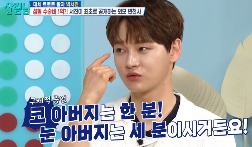 박서진이 '라디오 스타'에 출연하였는데, MC 김구라는 어디 어디 성형을 하였느냐는 질문에, 박서진은 "성형 하는데 1억이들었다, 코는 한번, 눈은 세번, 그래서 코 아버지는 한분, 눈 아버지는 세분이다"라고 하자,